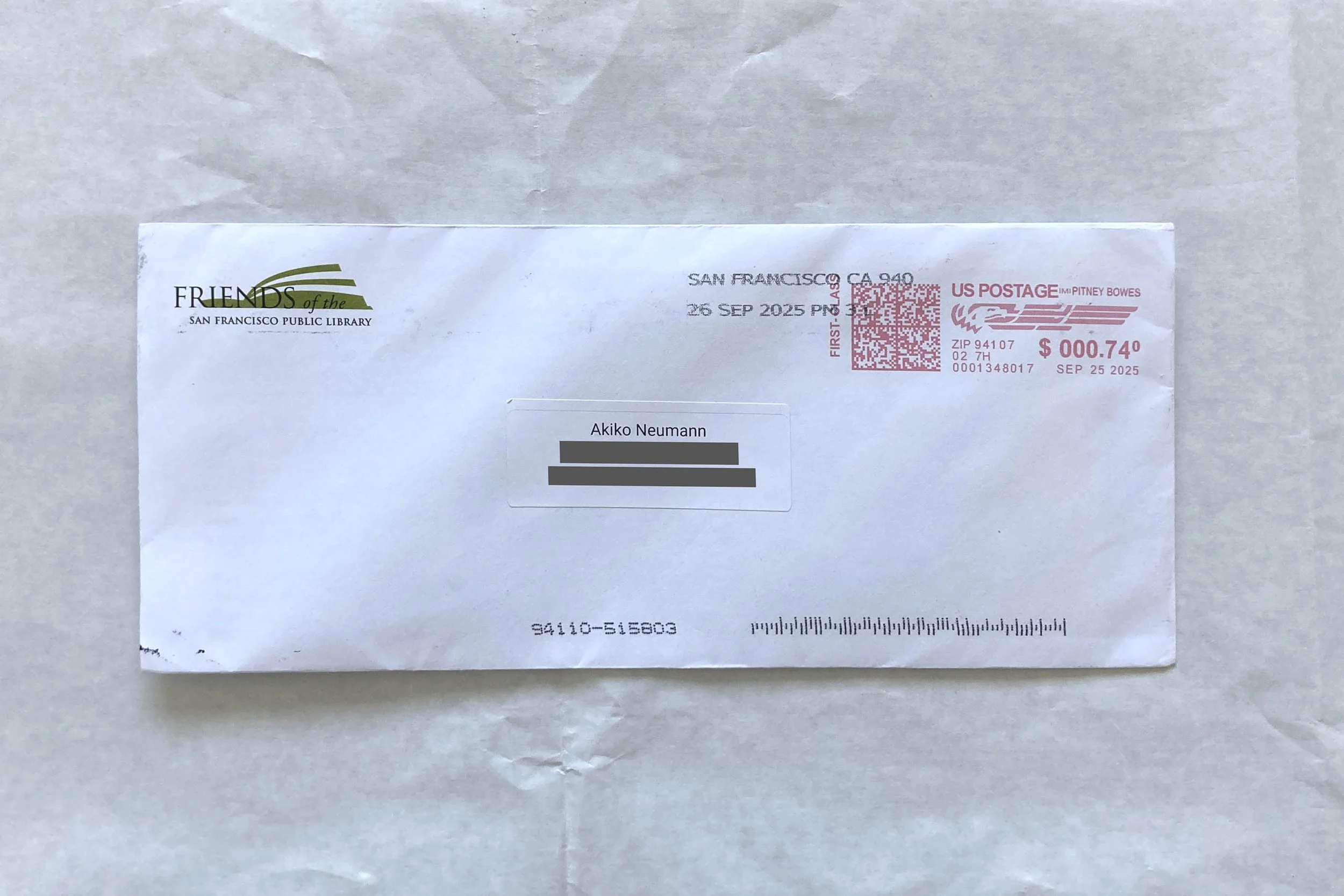 SFPL Mailing 1, September 2025. Original writing and drawings collaged with sourced material from the San Francisco Public Library collections. The first in a twelve-part mailing series supported by the Lisa Brown and Daniel Handler Residency with the Friends of the San Francisco Public Library. Mailed via USPS to over 100 recipients, printed on Risograph.
